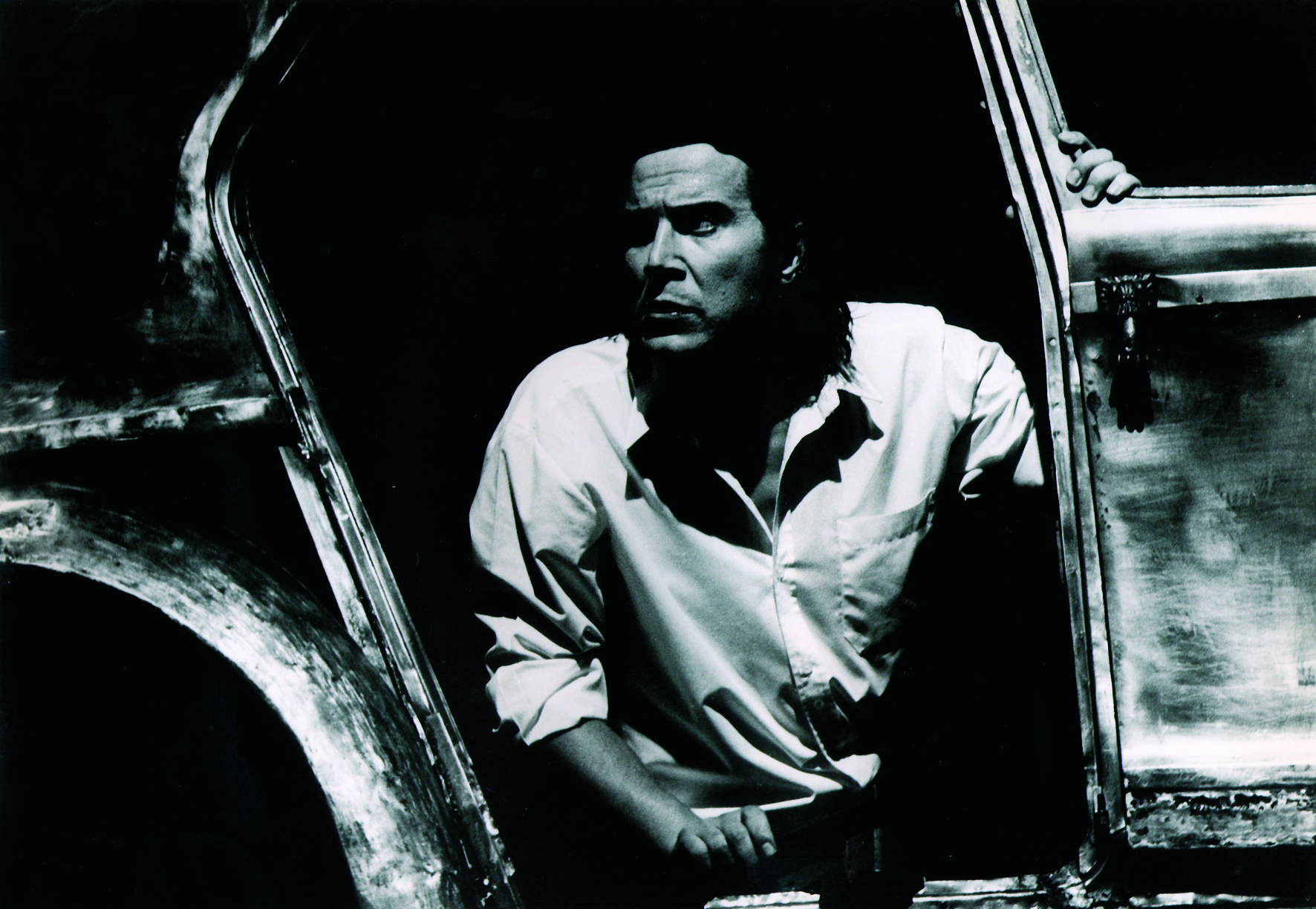 (Chofer leva a mão à cara, vê a mão preta, e fica envergonhado. Quanto mais esfrega, e tenta limpar, mais espalha e mais preto fica. Ao ver-se ao espelho, zanga-se, bate com a porta e sobe à grade. Inicia o texto do preso.)