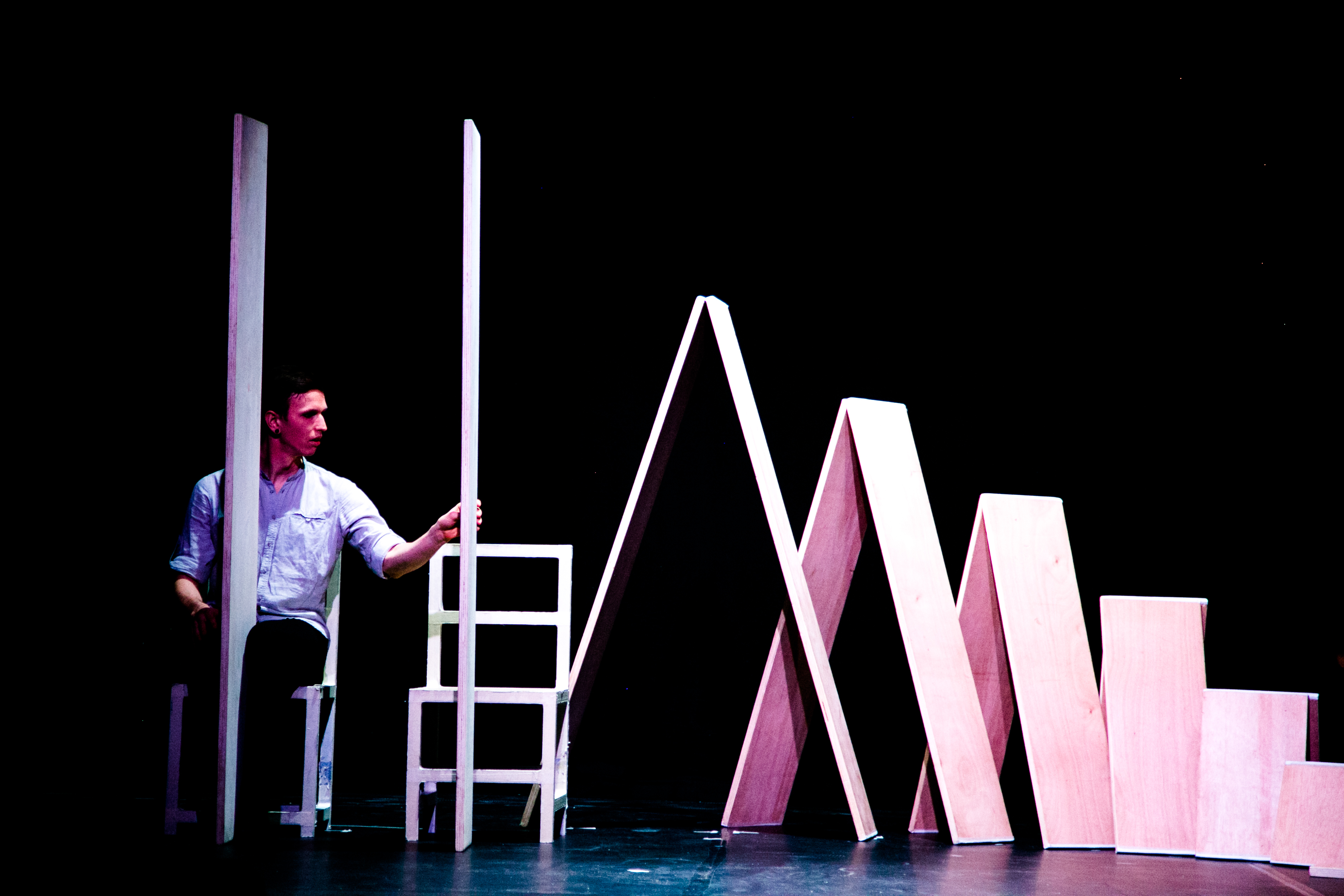 Em cena temos duas personagens e uma arquitectura de pranchas de madeira. Uma imagem surrealista e minimalista ao mesmo tempo e uma estética elegante na qual se desenvolve um jogo extremo: a procura dos limites do equilíbrio entre os corpos e as construções geradas com as pranchas de madeira.